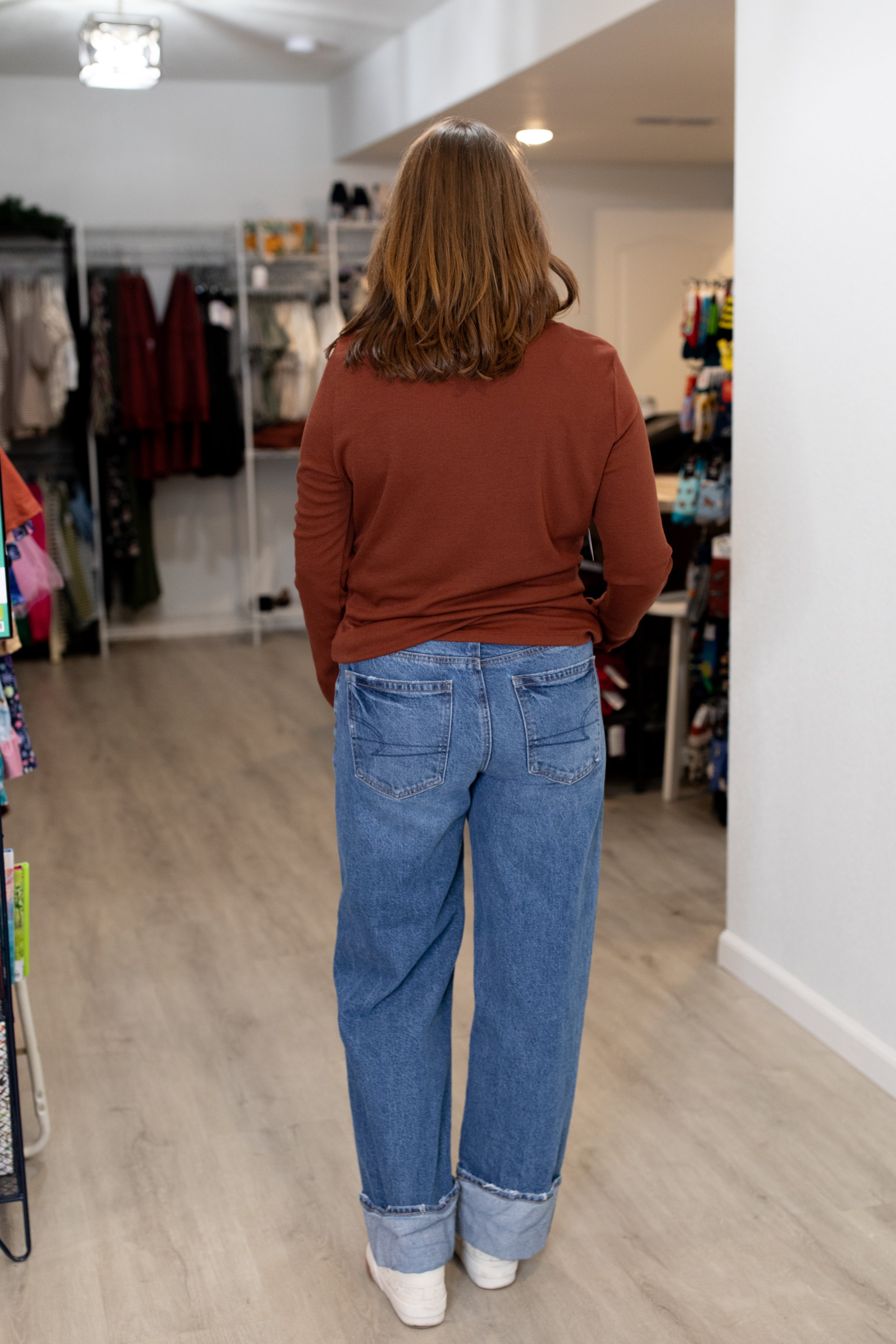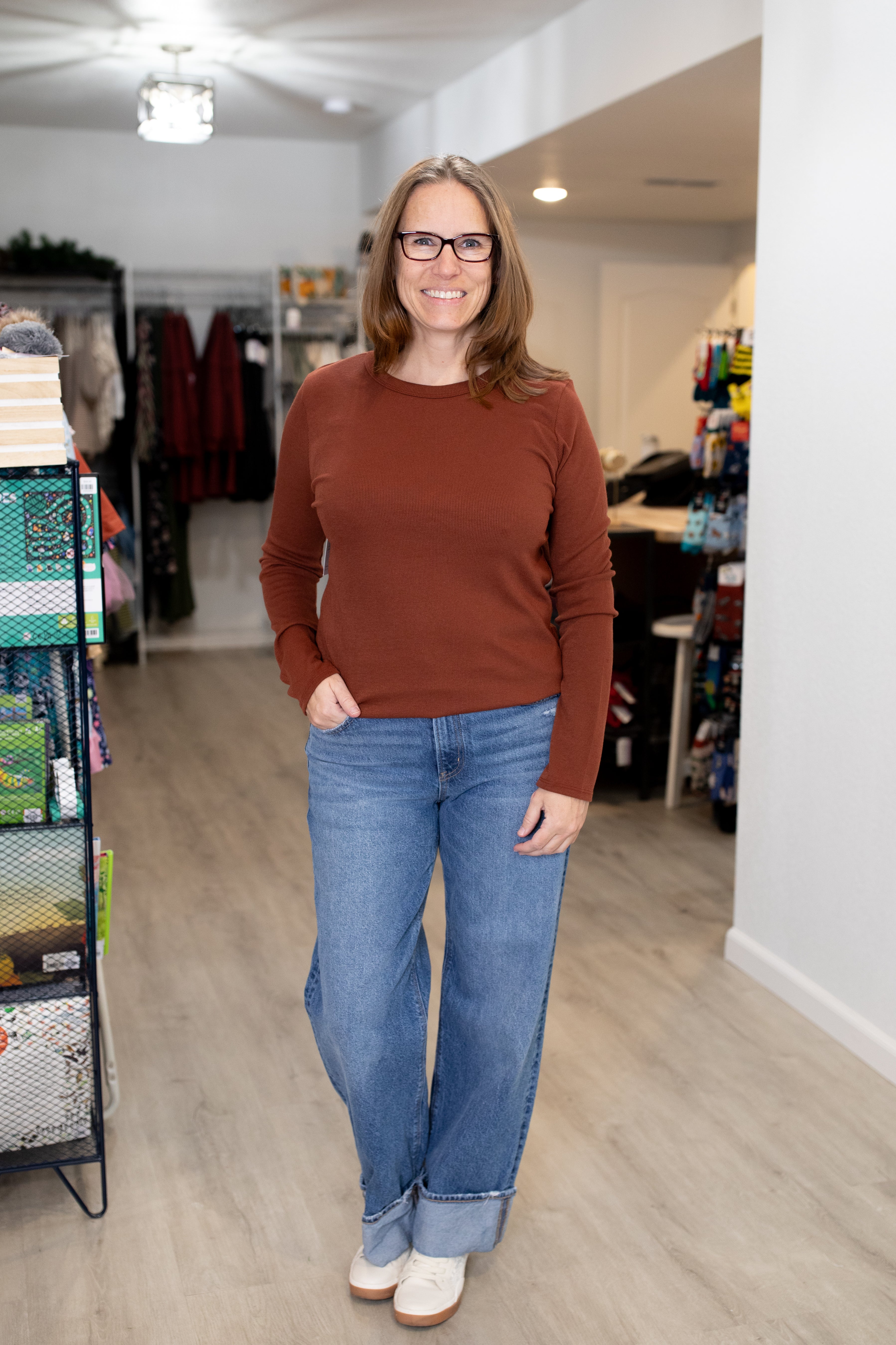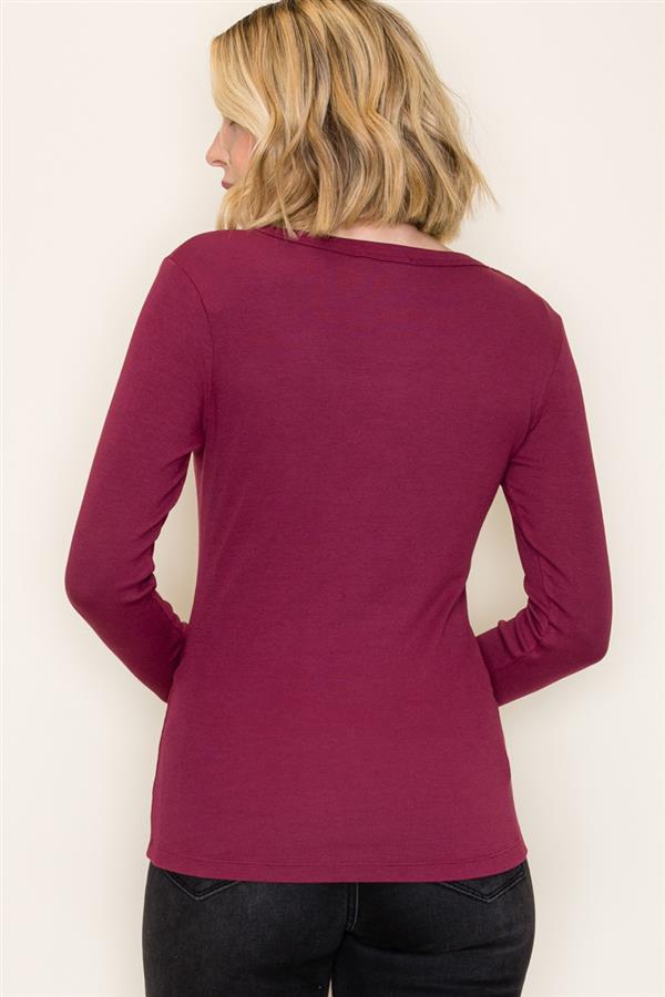 Comfort meets style in this irresistibly soft ribbed knit tee. The stretchy wine-colored fabric hugs your curves in all the right places, while the scooped neckline adds a flirty touch. With long sleeves to keep you cozy and a relaxed fit that moves with you, this basic tee is the perfect layering piece for cool weather. Wear it under a jacket for running errands, or dress it up with a statement necklace for a night out. However you style it, this versatile top is destined to become a wardrobe staple you'll reach for again and again. Crafted from a premium blend, it's made to last—and look amazing while doing it. Equal parts chic and snuggly, this ribbed wonder proves you don't have to sacrifice comfort for fashion.