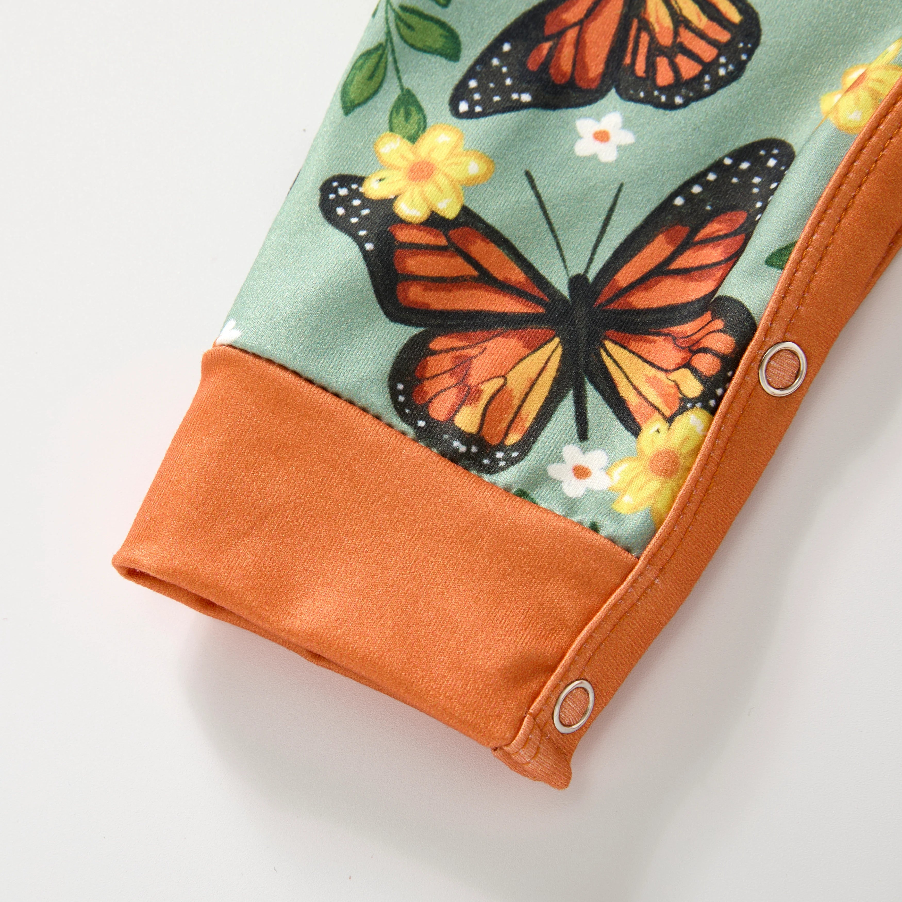 Covered in bold monarch butterflies and cheery yellow blooms, the Monarch Meadow Romper brings a burst of joy to baby's wardrobe. Soft, stretchy fabric makes it comfy enough for all-day snuggles and play, while the bright orange trim and snap legs make changes a breeze. And that heart-pocket detail on the back? Just the cherry on top.