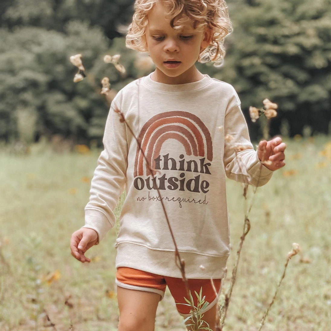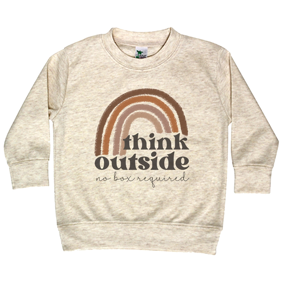 With vintage style, an original quote, and a trendy neutral rainbow- this shirt has it all! The shirt is made with regular sweat shirt material but has a relaxed crew cut fit that kids love.