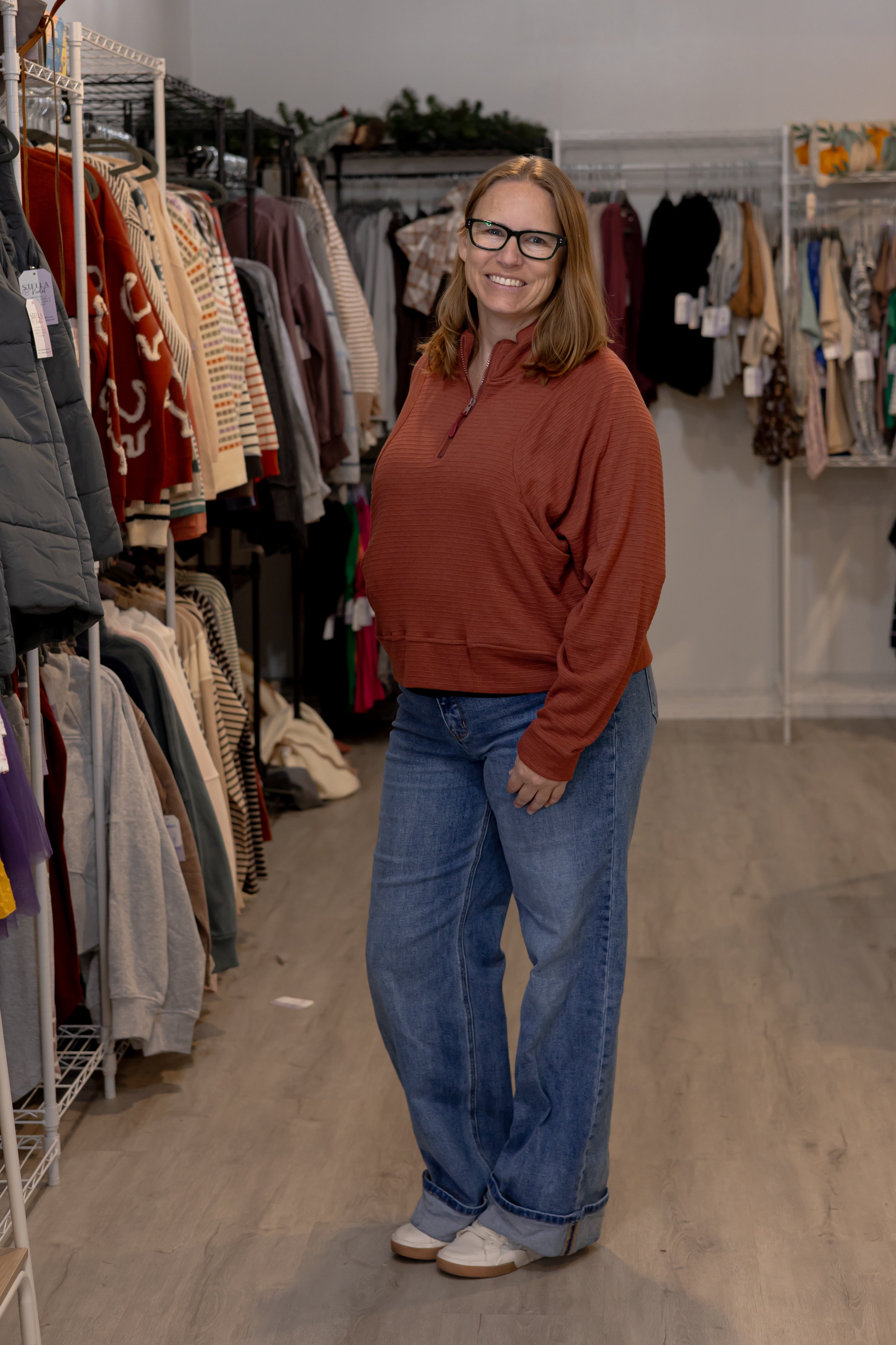 This sweatshirt is the textile equivalent of a warm hug on a crisp fall day. Its plush, textured fabric blend envelops you in cozy comfort, while the rich marsala hue evokes the moody ambiance of an autumn evening. The half-zip neckline allows you to adjust to your perfect temperature, whether you're layering up for a brisk morning walk or lounging fireside with a hot toddy. Slip into this long-sleeved layer and instantly elevate your weekend warrior esthetic with a touch of effortless cool. Soft enough for lazy Sundays yet polished enough for brunch dates, it's a versatile piece that pairs perfectly with leggings and mukluks or boyfriend jeans and booties. However you style it, this textured essential is about to become your go-to for snug sophistication all season long.
