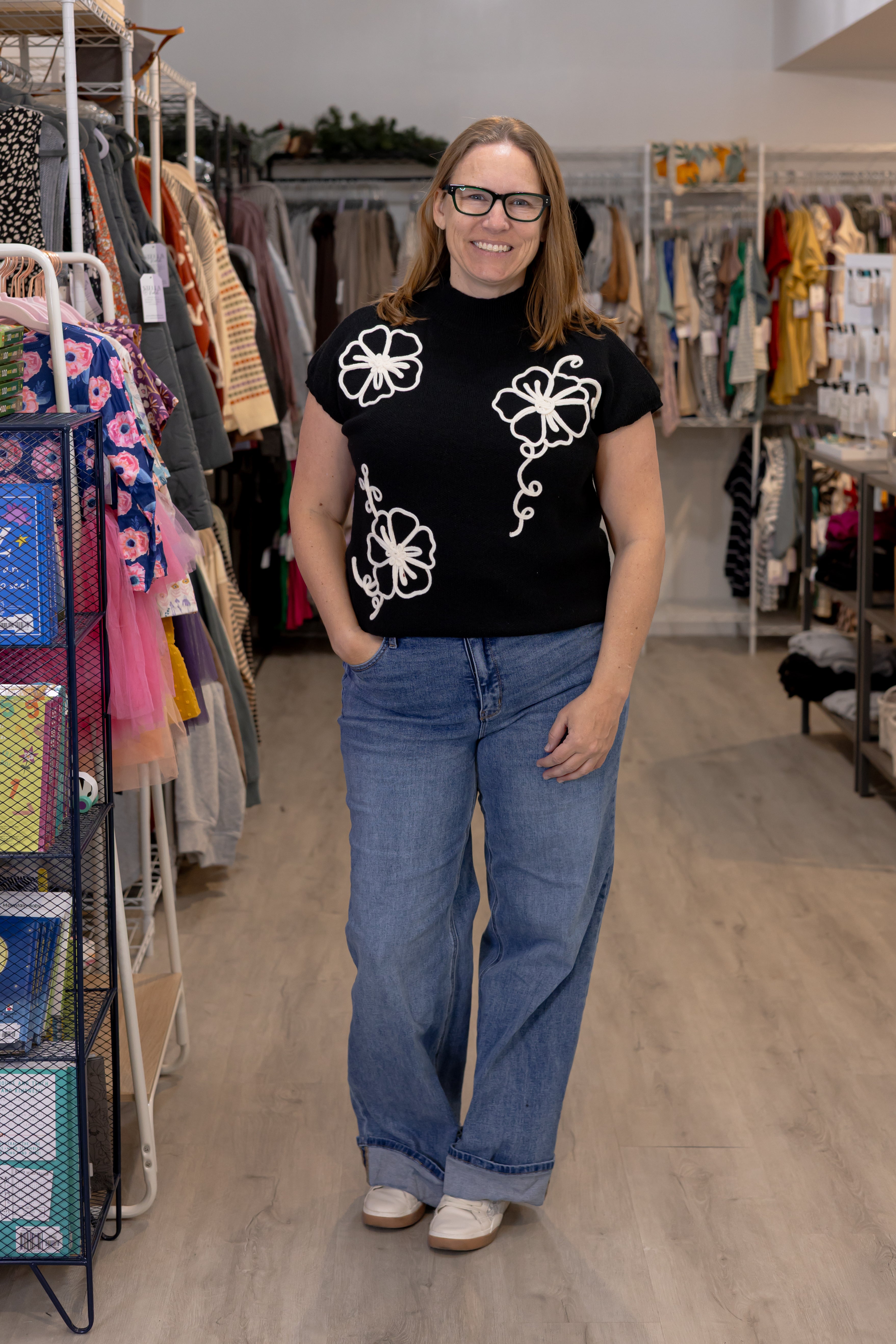 Bold, sweet, and a little unexpected—this sleeveless sweater tank brings serious charm. With a sleek black knit and dreamy white applique florals, it’s the kind of piece that makes an outfit all on its own. The mock neckline adds a polished touch, while the sleeveless cut keeps it summer-ready.