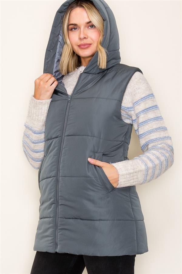 Dark Green Hooded Tunic Length Puffer Vest with Pockets