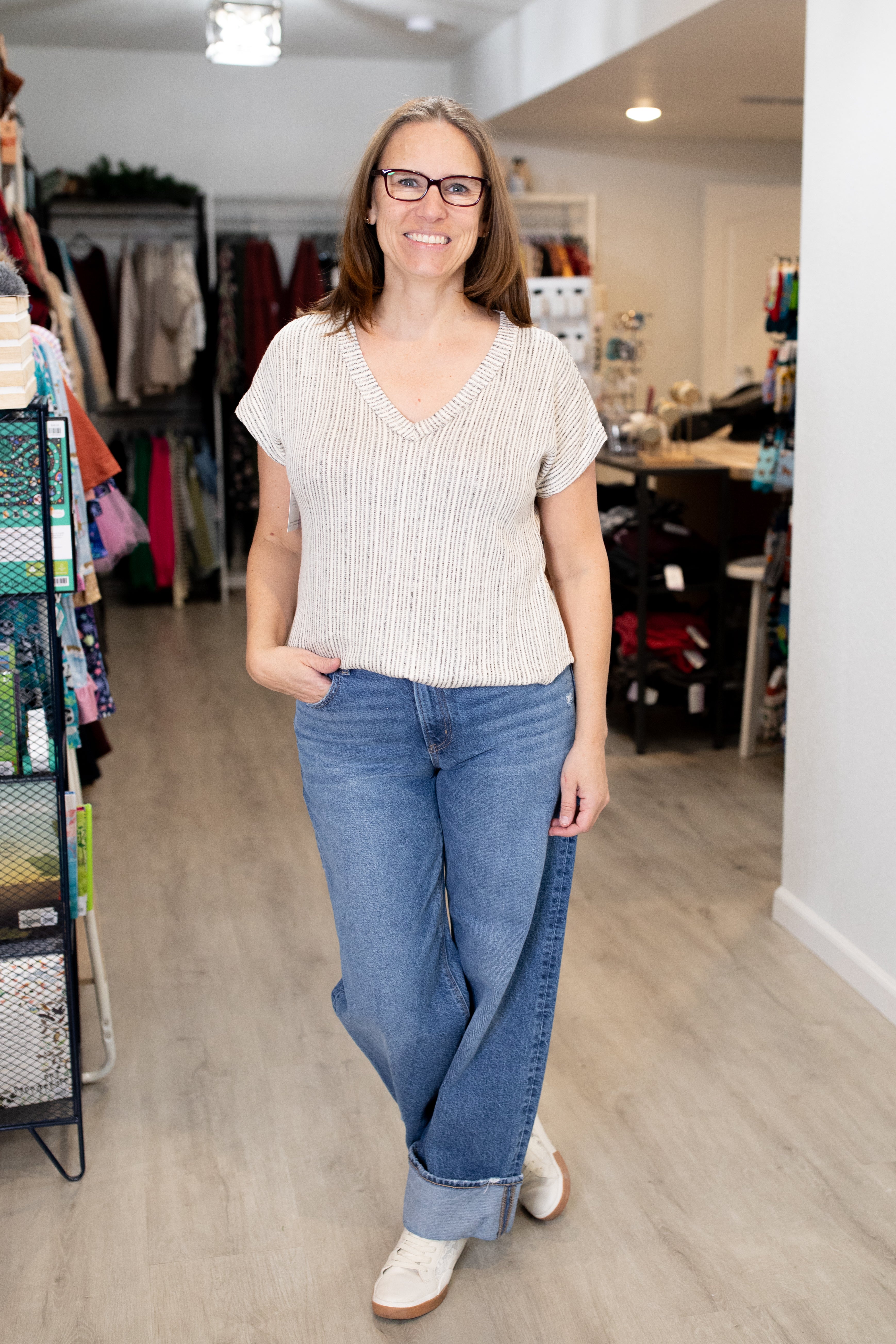 Striped sweater knits are having a major moment, and this v-neck top is here to help you ride the wave in style. The short sleeves keep you cool when the sun's rays are strong, while the soft knit blend caresses your skin like a gentle sea breeze. With its classic v-neckline and playful stripes, this top effortlessly captures that breezy, beachy vibe whether you're strolling the boardwalk or brunching al fresco. Throw it on with cutoffs for an easy weekend look, or dress it up with linen trousers for a casual-chic dinner ensemble. However you wear it, this sweater knit brings the laid-back spirit of the coast wherever your day takes you. The only thing more fun than the stripes? The double-takes you'll get rocking this trendy, vacation-ready top.
