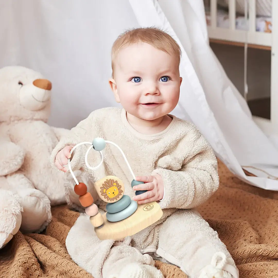 Play with your lion friend, king of the bead maze! Little hands can move the soft colored beads over, under and across the wire bead frame as they go. This toy encourages dexterity, hand/eye coordination and color recognition as toddlers guide the 7 beads from one side of the frame to the other. This toy is crafted from sustainably sourced wood from FSC® certified forests and coated with non toxic paint.