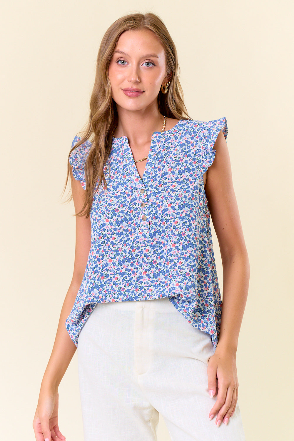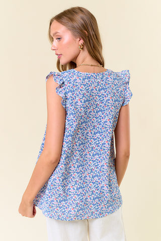 Soft florals, sweet ruffles, and just the right amount of charm. This ditsy floral blouse brings a breath of fresh air to your everyday lineup. The fluttery ruffle shoulders and short sleeves keep it playful, while the easy blue print makes it feel effortlessly feminine.