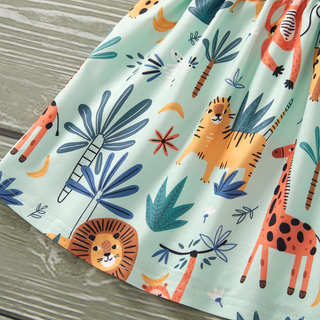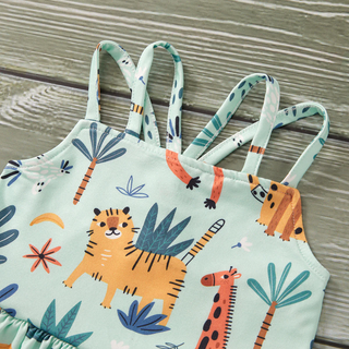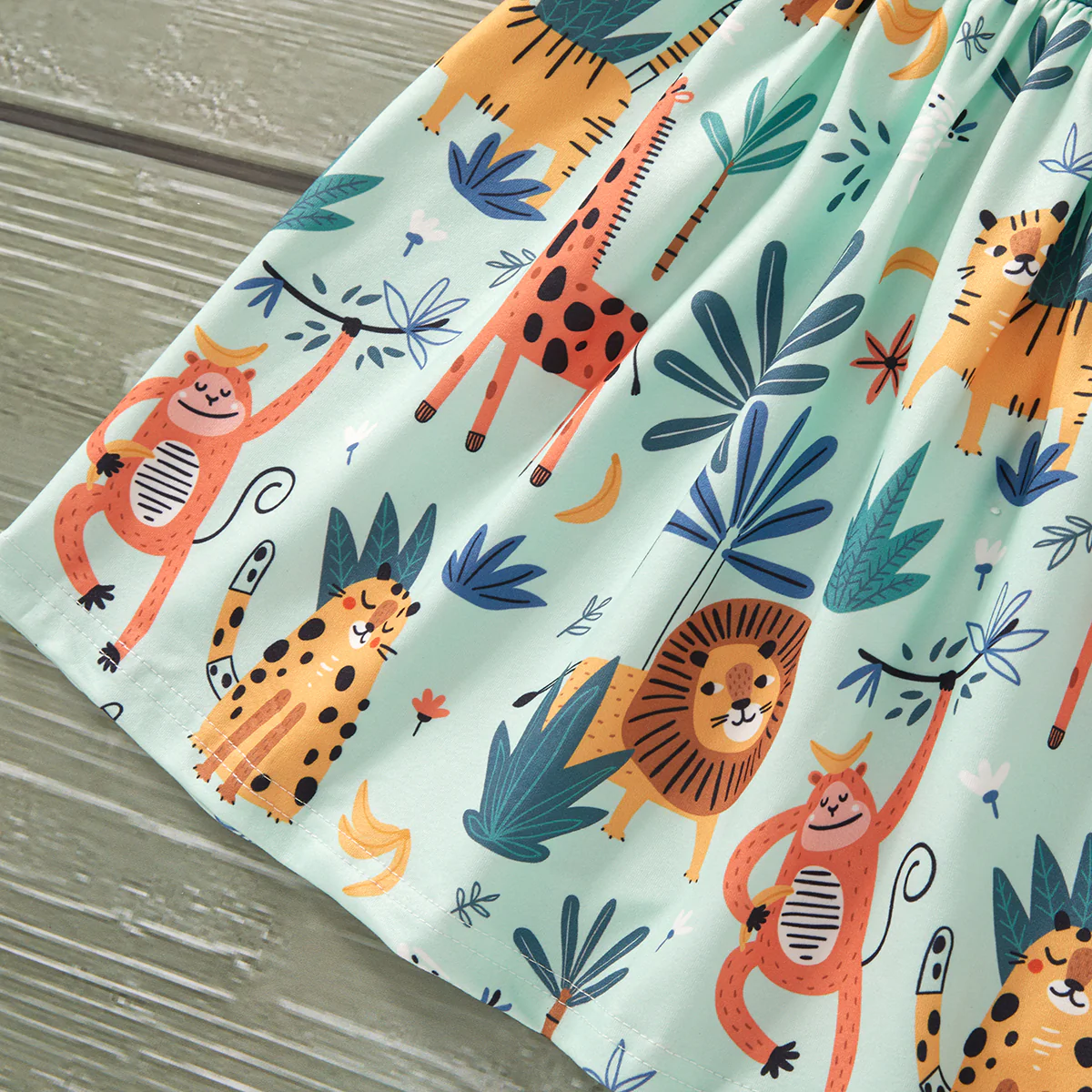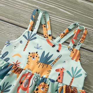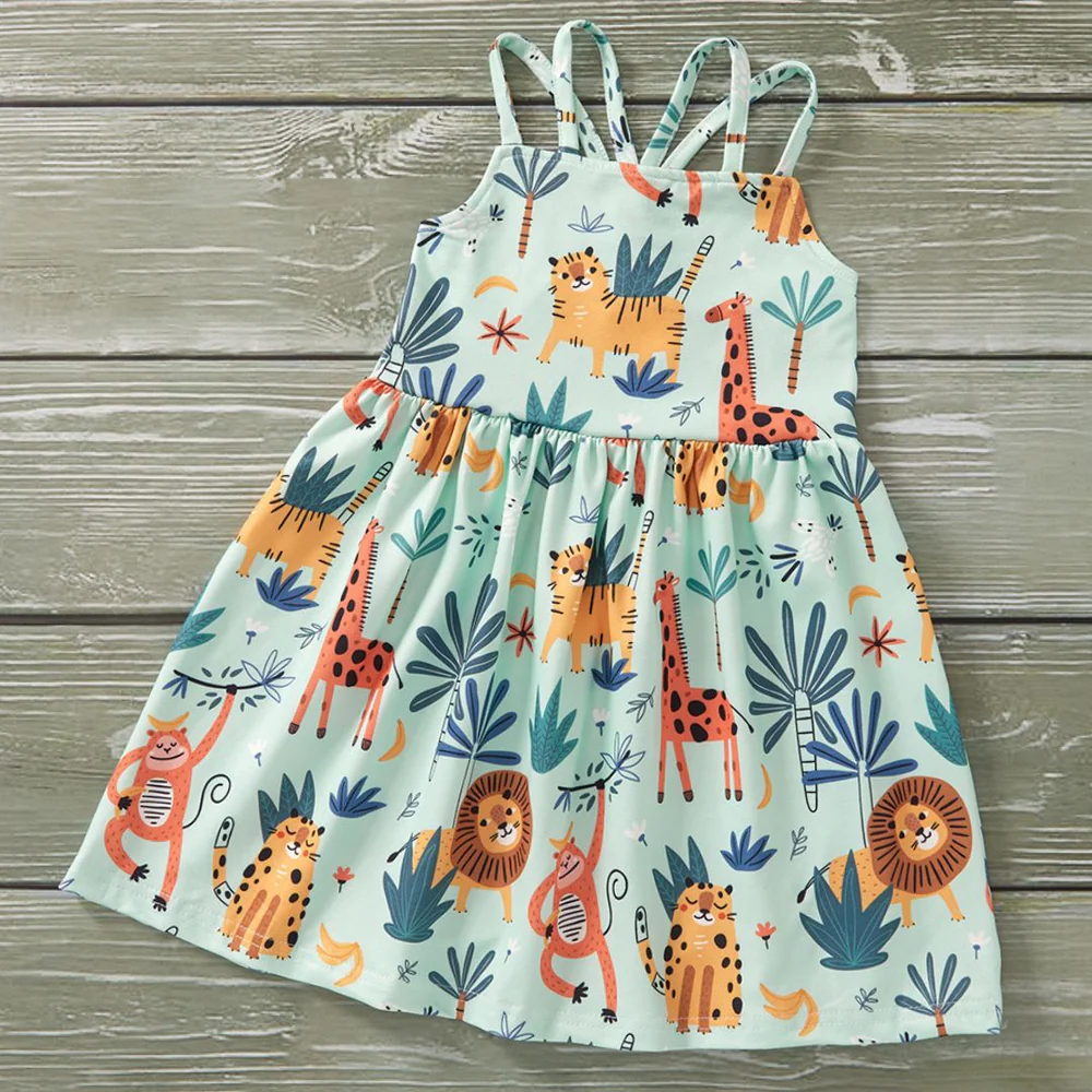 This strappy little sundress is a jungle of fun! The soft, stretchy blend keeps things comfy while she monkeys around, but it's the vibrant print that really swings. Whether she's romping at the park or braving the backyard, this breezy dress lets her channel her inner wild child in vivid style. Easy pull-on convenience makes getting dressed a total breeze. Just slip it on and let her imagination run free—who knows what kind of escapades await in her leafy paradise? From playdates to picnics, this whimsical little number brings all the energy and excitement of an exotic safari. Get ready to go bananas!