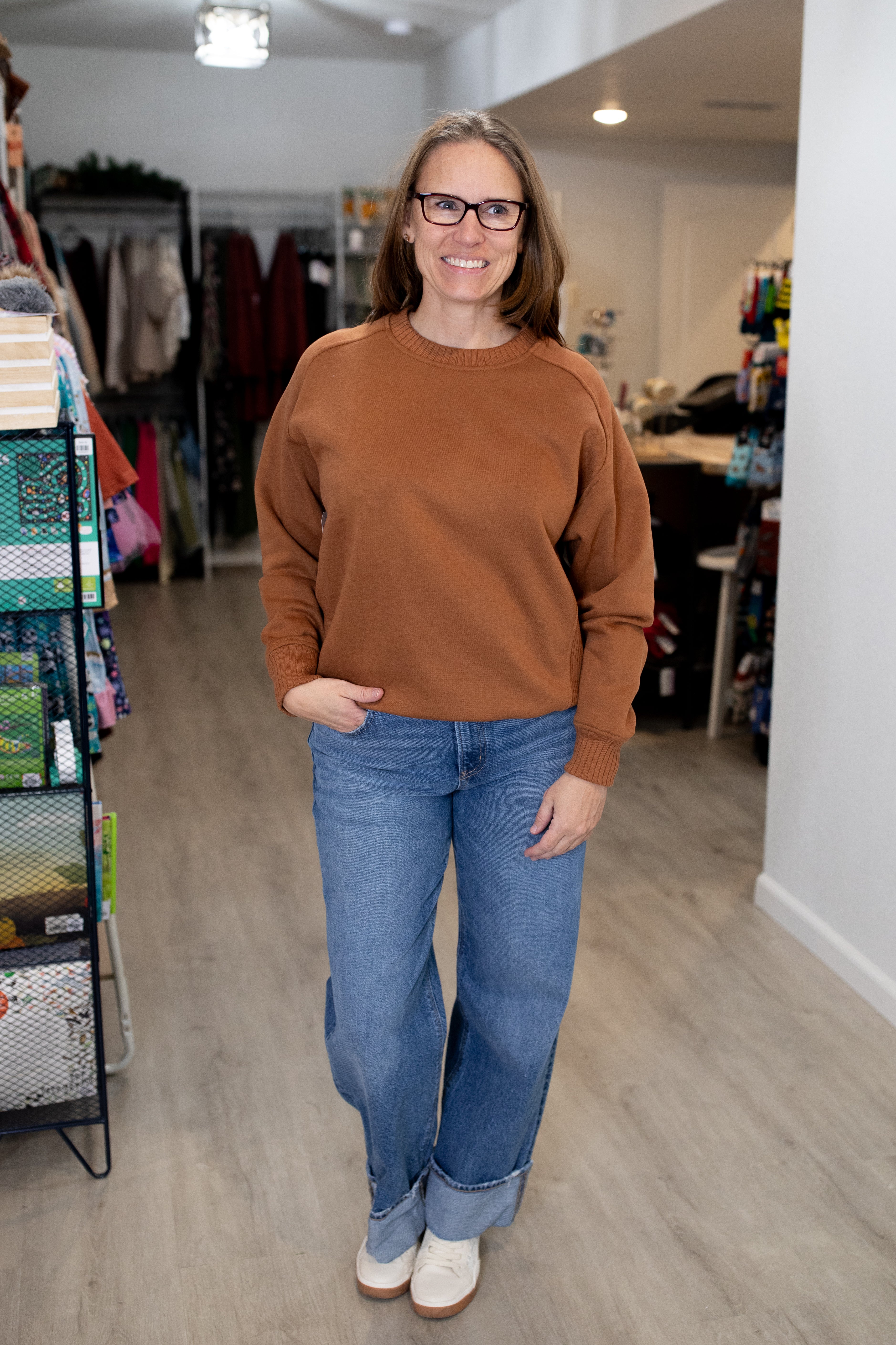 This rust-colored crewneck is your new go-to for cozy style. Crafted from an ultra-soft fabric blend, this top envelops you in its warm embrace while its relaxed fit gives you room to move. Whether you're curling up on the couch, running errands around town or meeting friends for coffee, this versatile essential has you covered. Pair it with jeans for a casual weekend look or dress it up with trousers and heels for an effortlessly stylish ensemble. However you style it, this top is destined to become your new favorite—you'll never want to take it off. Comfort and style join forces in this simple yet statement-making piece.